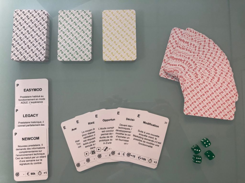Pour aller plus loin, cette formation à la gestion de projet se conclue par un « serious game » permettant de mettre en pratique la méthode. Ce jeu est basé sur un jeu de carte permettant de reproduire le déroulement d’un projet : choix d’un prestataire, planification, hypothèse d’élongation et de coût, occurrence de risques et d’opportunités, impacts sur la qualité de la solution et sur satisfaction client,…